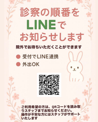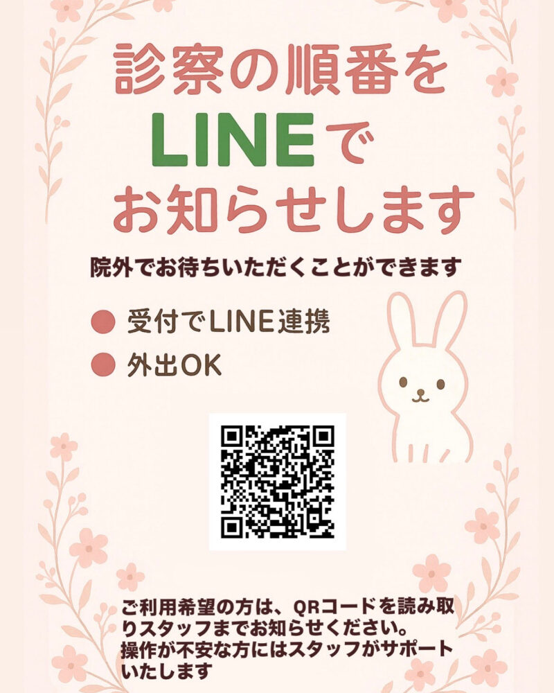 診察が近づきましたらLINEでお知らせします。外出OK🌸メールでも対応可能でございます。ご希望の方は受付にお声掛けください。